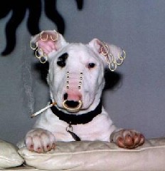 ก็เบื่อเซ็งตอกย้ำความซ้ำซาก ขอลาจากชีวิตเก่าที่เฉาเหี่ยว เป็นตัวใหม่ใครไม่มองแค่ครั้งเดียว ต้องแอบเหลียวมองมาอีกคราครั้ง จะหลุดโลกโศกกระจุยลุยแฟชั่น เปลี่ยนทุกวันอย่าหันเหของเลหลัง มีมากมายถ่ายเทประเดประดัง ถูกใจจังหมารุ่นใหม่ไฉไลจริง พื้นที่หูมีเท่าไรใส่ให้หมด อย่าเลี้ยวลดเจาะจมูกใส่ลูกกลิ้ง ดั้งก็งามทรามวัยใจถึงจริง เจาะจนพริ้งหลายรูดูกวนกวน เล็บก็งามถามซิทำที่ไหน สี่เท้าไงทำได้ใช่แกล้งป่วน ช่างฝีมือดีแท้ไม่แปรปรวน เป็นกระบวนงานเยี่ยมใครเทียมทัน เป็นหมาโก๋กวนใจใครหรือเปล่า มีเรื่องราวมากมายให้สุขสันต์ มาซิเพื่อนพี่น้องลองทำกัน สมใฝ่ฝันเป็นหมาโก๋โก้กว่าใคร...อิอิ รูป: http://i57.photobucket.com/ albums/g231/adresaklumea/ funny-dog/rebellion.jpg