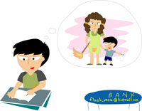 คุณครู พูดกับนักเรียนว่า "ใกล้จะถึงวันแม่แล้ว นักเรียน วันนี้ครูมีการบ้านให้เธอ คือเขียนเรียงความวันแม่ อย่าลืมเอามาส่งพรุ่งนี้ทุกคนนะ"