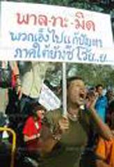 บัดนี้ การเมือง เป็นพิษ พันธมิตร ร่วมชุมนุม ชุมนุม คนไทย ปวดใจ กลัดกลุ้ม เรื่องร้าวรุม ให้หวาดกลัว หวาดกลัว ตั้งมั่น สะพาน มัฆวาน รัฐบาล นั้นปวดหัว ปวดหัว ขับไล่ มนตรี ใจชั่ว หลงเมามัว บ้าอำนาจ อำนาจ สนธิ จำลอง ร่วมใจ สุริยใส ไม่ขี้ขลาด ขี้ขลาด ต่อต้าน รัฐบาล ขายชาติ ป่าวประกาศ บนเวที เวที วางแผน ทำดาว กระจาย อภิปราย ไปทุกที่ ทุกที่ ปะทะ ชาวบ้าน น้องพี่ เข้าทุบตี ต่างโรมรัน โรมรัน สองฝ่าย ไม่ฟัง คำเตือน กล่าวเชือดเฉือน โหมห้ำหั่น ห้ำหั่น ใช้สื่อ ประชด ต่อกัน ดุจประชัน รบราวี ราวี ทำให้ บ้านเมือง วายวุ่น นักลงทุน ต่างหน่ายนี หน่ายหนี คนไทย ไม่สา-มัคคี แผ่นดินนี้ ลุกเป็นไฟ เป็นไฟ ฯ