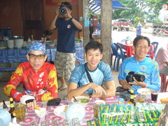 ตื่นแต่เช้าข้าวของรื้อกองสุม เร่งขยุ้มลงกระเป๋าก่อนจะสาย หาเสบียงปั่นเคียงร้านเรียงราย มีของขายริมโขงก่อนลงเรือ จักรยานผูกรั้งบนหลังคา แล้วเลือกหาที่นั่งพอยังเหลือ ทั้งฝรั่งลาวไทยใจเอื้อเฟื้อ เป้าหมายเพื่อหลวงพระบางร่วมทางจร แม่โขงขุ่นเชี่ยวไหลไม่สิ้นสั่ง สองฟากฝั่งโขดผาศิลาสลอน เป็นเลื่อมลายแลลับสลับซ้อน บางช่วงย้อนไหลเลี้ยวเป็นเกลียววน บ้างชื่นชมซึมซับบ้างหลับใหล บ้างเล่นไพ่บ้างขับร้องไม่หมองหม่น อ่านหนังสือกันบ้างเป็นบางคน จวบเวลาผ่านพ้นจนบ่ายเย็น เรือเทียบท่าถ่ายเทสัมภาระ ระเกะระกะคนของต้องลากเข็น เชียร์ที่พักทักทายน้ำลายกระเด็น ต่างตื่นเต้นเมื่อมาเห็นหลวงพระบาง สามเสือได้ห้องพักเป็นลักกี้ ชื่อว่าเฮือนโชคดีมีห้องว่าง ด้วยสนนราคาอัตรากลาง มีทุกอย่างอำนวยช่วยผ่อนคลาย