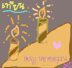 ไฟดับวันนั้น .............. ฉันหวาดผวา เอื้อมมือไขว่คว้า ......... หาที่เกาะไว้ แม่ค้นเล่มเทียน .......... จุดเวียนไสว ฉันจึงอุ่นใจ ............... เปลวไฟสวยดี จุดเล็กสว่าง ............. กลางมืดราตรี ไฟดับกี่ที ................. เทียนมีส่องแสง น้ำตาเทียนไหล .......... เทียนไขหมดแท่ง เทียนเล่มไม่แพง ....... จุดแบ่งแทนไฟ ไฟดับวันนั้น ............ ฉันแสนดีใจ เห็นเทียนเล่มใหม่ ...... แสงไฟงามตา.