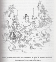 นิทานจันทโครพในวงเหล้า สาเหตุที่นางโมรายื่นปลายพระขรรภ์ให้พระจันฯ ด้ามให้กับโจรก็เพราะนางโมราได้เห็นข้อเปรียบเทียบ เมื่อโจรปล้ำกับพระจันฯ จนผ้าเตี่ยวหลุดลุ่ย อิอิ