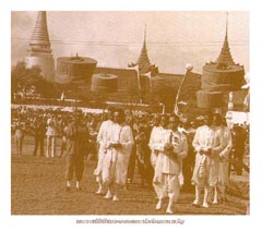 จรดพระนังคัลแรกนาขวัญ ราชพิธีไถหว่านโบราณเริ่ม ปลายกรุงศรีฯ มีให้เห็น เป็นประเดิม พืชมงคล ฝนแรกเจิม เริ่มแรกนา พระโคคู่ รู้ลากไถถากร่อง เทพีสอง หาบทองเงิน เทินเมล็ดกล้า โปรยข้าวพันธุ์ หว่านประเดิมเริ่มเพลา พระยาแรกนา นำพิธีศรีมงคล มวลพืชพันธุ์ธัญญาเติบกล้าใหญ่ แตกกิ่งใบให้ดอกออกผลิตผล เป็นปัจจัย ให้คงอยู่เลี้ยงผู้คน ควรค่าล้น คนรู้ค่าแห่งกล้าพันธุ์ เก็บเมล็ดข้าว ! เข้าพิธี ที่สนามหลวง เป็นขวัญดวงให้ข่วงนาจากฟ้านั้น เป็นเชื้อนำ.. ทำนาหยั่งกล้าพันธุ์ เป็นพลังมั่น.. ขันแข็งแห่งจิตใจ ดินคอยฟ้า นาข้าวเฝ้ารอฝน โปรดบันดลฝนพรำนำน้ำให้ หล่อเลี้ยงพืช เผ่าพันธุ์อันอำไพ เพื่อเติบใหญ่ให้ผลิตผล..เลี้ยงคนกิน ! จากแผ่นฟ้าจรดแผ่นพื้น.. สุดชื่นฉ่ำ ฝนพร่างพรำนำโชคดีทุกที่ถิ่น แรกนาขวัญมงคลเริ่มเจิมผืนดิน ทั่วธรณินถวิลหวัง.. ดังคำทาย
