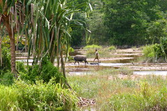 จากเสี้ยวตอนหนึ่ง ในเรื่องรักรจนา ขวัญข้าวขวัญชีวิต http://www.thaipoem.com/forever/ipage/poem76322.html ขวัญข้าว ขวัญชีวิต! http://www.thaipoem.com/forever/ipage/song6197.html อัญเชิญบทเพลงพระราชนิพนธ์..สายฝน..) .......... ลำเนาไพร กำลังจะไปเยี่ยมเพื่อนรักคนดีที่สุรินทร์ และ กำลังใช้เส้นทางอิสานใต้สาย226 เลาะเลียบเส้นทางรวงข้าวรวงทอง ที่กำลังแตกยอดละอออ่อนผ่องละมุน ไหวกอรอรับสายฝนพรมพรำ ทั้งนาดอน และ นาในระบบชลประทาน ลำเนาไพร อยากจะร้องไห้ตลอดทาง กับเส้นทางสายงามนี้ ที่คิดถึงมิ่งมิตรกวีคนดี ที่เคยรจนาไว้นานมา ให้มาหวานหอมออดอ้อนสะออน อ่อนโยนละมุนละไมในหัวใจเป็นยิ่งนักแล้ว เส้นทางสู่ชนบท.... ลำน้ำน่าน เมื่อลมล่องข้าวเบาเงาเมฆเคลื่อน ท่ามกลางเดือนฝนฟ้าจะลาล่อง ริ้วรวงข้าวแตกดอกออกรวงรอง มีเพียงฉันเที่ยวท่องล่องเรื่อยมา จากถนนเมืองเก่าเงาโอฬาร มีเพียงบ้านทอดนิ่งชินหนักหนา ข้างนอกรุ่งในบ้านร้างทางน้ำตา มองขอบฟ้าแคบนิดขังปิดไว้ เงาตะวันเคลื่อนคล้อนสะท้อนดวง เมื่อฝนร่วงหล่นนานวิญญาณไหว บ้านหลังเก่าทอดเผยเปรยรำไร ติดปีกฝันวิญญาณไพรให้กระเซ็น สู่เส้นทางรายล้อมด้วยกองฟาง ถูกปล่อยร้างสีหม่นจนเลือนเห็น เถาย่านางยอดสล้างกลางลำเค็ญ ไม่เคยเว้นแตกช่อกอชีวิต คือเส้นทางสายนั่นฉันเคยผ่าน ทุกวันวานภาพเก่าเงาตามติด ถือปิ่นโตตามแม่สูงแค่นิด ดอกข้าวติดแตะแก้มแย้มทายทัก ฉันเปียกโชกแล้วแม่แท้ไม่ทัน แม่ยิ้มหันหัวเราะเพราะข้าวหนัก หยุดเดินทางให้ฉันนั้นผ่อนพัก หยิบปิ่นโตแห่งรักไปถือแทน แม่บอกฉันนั่นคือลูกชาวนา เกิดใต้ฟ้านาดินถิ่นหวงแหงน ในความจนรากเหง้าเราขาดแคลน แต่ดวงใจฉาบแน่นแผ่นทองทัน รายริมทางพร่างพราวด้วยข้าวรวง ฝนจากสรวงปราดหนึ่งตรงบึงนั่น แม่บอกกล่าวฝนฤดูผู้กำนัล โปรยฝนฝันไล่ล่องท้องข้าวเบา หยาดน้ำค้างแต้มดอกหมอกตรงโน้น เสียงตะโพนแว่วฟังดังหงอยเหงา พระสงฆ์เดินฝ่าน้ำค้างย่างแผ่วเบา ทุกยามเช้าบิณบาตรตามยาตรา แม่และฉันสวนทางกลางครรลอง พระท่านมองเงียบนิ่งยิ่งค้นหา แม่บรรจงตักข้าวเคล้าแกงปลา อธิษฐานต่อหน้าพระพุทธพงศ์ ให้ลูกชายชาวนาทายาทหนึ่ง ได้พบซึ้งรสธรรมนำสู่หงษ์ ถางเส้นทางร้างไร้ในกลางดง สืบเกวียนกงบรรทุกข้าวชาวนาไป ไปหว่านหวังกลางทางทุกย่างก้าว ให้ข้าวขาวแตกดอกงอกไสว ในสามัญสำนึกตรึกตรองใจ สืบสกลคงไว้ความสามัญ แม่วางข้าวช้าลงตรงบาตรพระ ทุกผัสสะเงียบนิ่งคล้ายปริ่มฝัน เรื่อลำแสงสะท้อนงามตามตะวัน เส้นทางฝันสายรวงข้าว...ฉันเข้าใจ ------------------------ ข้าพเจ้าชอบที่จะเดินไปบนเส้นทางสายรวงข้าว ที่ที่มีผืนนาเขียวขจี มีลมล่องข้าวเบาพัดแผ่ว ใน
