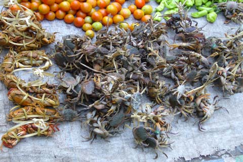 . . . คนท้องถิ่นจับปูที่ลำธาร มาย่างขาย