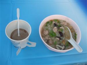 เกือบเจ็ดโมงฉันเดินลงไปทานอาหารเช้า มีข้าวต้มเครื่องใส่เห็ดหอมสดกับหมูบด รสชาดอร่อยอีกแล้ว และตามด้วยกาแฟร้อนอีกครึ่งถ้วยกระดาษ