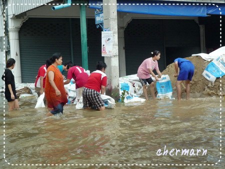 ที่เห็นโดนทั่วไปคือผู้คนช่วยกันกรอกทรายใส่กระสอบ สร้างกำแพงกั้นน้ำเข้าบ้านค่ะ