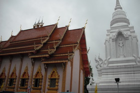 ที่แปลกตรงที่มีเจดีย์สีขาวต่างจากวัดอื่น ๆ ที่มีสีทองอร่ามตรงนี้เองที่ฉันพบฝรั่งหัวใจไทย เค้าเข้ามาถามเส้นทางไปเที่ยวในเชียงราย ฉันยิ้ม แล้วนึกในใจ เออว่ะเป็นเจ้าบ้านที่ดีสักวัน ชวนเที่ยวด้วยกันเลยดีกว่า ไหน ๆ ก็ไหน ๆ ภาษาเรื่องจิ๊บ ๆ อยากไปไหนฝรั่งชี้รูปในหนังสือ อ้อยก็ถามคนเชียงราย ไปกันโลด ฉันก็ขับมอเตอร์ไซด์นำ ฝรั่งก็ขับมอเตอร์ไซด์ตาม ที่แรกที่พาไป คุ้มเมืองมาง เค้าทำสินค้าที่ระลึกส่งขาย