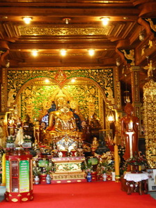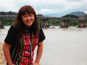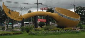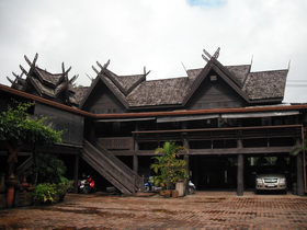 พอเราเข้าไป เค้าก็มองกันแปลก ๆ ฉันเกรงในสายตาก็เลยเข้าขออนุญาตถ่ายรูป เจ้าของบ้านถาม มากับทัวร์เหรอคะ ฉันยิ้ม แล้วบอกว่า เปล่าค่ะมาสองคน เค้ายิ้มแล้วบอกว่า แฟนหล่อจังนะคะ ฉันหันไปยิ้ม แล้วหันไปถามฝรั่งที่มา What your s name (กรุณาออกเสียงผิด ๆ ตามที่ฉันพิมพ์) เจ้าของบ้าน ร้องอ้าว แล้วบอกว่า เชิญค่ะ เราถ่ายรูปกันสักพัก ก็ขับรถเข้าเมือง ผ่านศูนย์ ศิลปวัฒนธรรมเชียงราย ฝรั่งถามถึงกระบวยใหญ่ ๆ ที่อยู่ด้านหน้าว่าคืออะไร ฉันตอบว่า It same same A big cup with the long arm, you understand . ฝรั่งเกาหัวแกรก ๆ No,what is it ? เค้าคงไม่เคยเห็นถ้วยที่มีแขนยาว ๆ (ฮา)