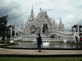 เมื่อความหิวมันรบกวน ฮุกซ้ายย้ายมาขวา ฉันก็เดินกลับเข้าตลาดกินก๋วยจั๊บ รำแต้ ๆ เน้อ ถามทางเค้าไปเรื่อย ลุงๆ วัดร่องขุ่นไปทางไหน คุณลุงใจดีบอกว่าขึ้นมาเลย ลุงไปส่งที่ท่ารถไปวัดร่องขุ่นโดยไม่คิดตังค์สักบาท ขอบคุณค่ะลุง ขอบคุณมาก และขอบคุณตรงนี้ให้กับความมีน้ำใจของคนเชียงราย ร้อยฝันประทับใจมากขอบอก เส้นทางไปวัดร่องขุ่นโดยรถเมล์ ฉันไม่รู้อยู่ทางทิศไหน แต่ก็อย่างที่บอกคนเชียงรายน้ำใจงามจริงๆ ฉันไปถึงวัดร่องขุ่นที่ใคร ๆ ก็กล่าวขวัญถึง สวย จริง ๆ ความสวยของวัดทำให้ฉันอิจฉา ตาร้อน แถมยังตาหยีเพราะมีแต่สีขาวแสบตา ฉันจึงหามุมหลบสายตาเป็นม้ายาวแถว ๆ อาคารแสดงภาพของอาจารย์เฉลิมชัย นั่งทำความเคารพคนผ่านไปมาอยู่คนเดียว (555)