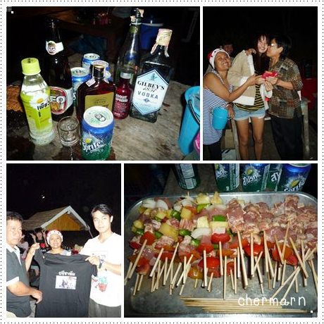 ทุกคนมาพร้อมหน้าแล้ว ทุกๆปีคนจะไปเกือบ 30คน หรือไม่ก็30+ แต่ปีนี้ นับหัวแล้วมีไปแค่ 17 คน แต่พวกเราก็สนุก สนานกันเต็มที่ สร้างบรรยากาศให้ครื้นเครง คิดว่าเหล้าจะเหลือ ก้ไม่เหลือ อิอิ ไม่รุ้ใครรับประทานเข้าไปแทนน้ำ อิอิ พอถถึงวันเคาท์ดาวน์ พี่ชายก็แจกเสื้อยืดสกรีนทีมให้พวกพี่น้องทุกคน มีการจับสลากของขวัญ ย่างบาร์บีคิว มองดูดาว เต็มท้องฟ้า เวลา 4 ทุ่ม ตามคำนายของเด็กชายปลาบู่ พวกเราก็ลุ้นๆกันว่าน้ำจะลดไหม จะได้วิ่งขึ้นเขาทัน แต่เหตุการณ์กลับสงบดี ใกล้เวลาเที่ยงคืน ของคืนข้ามปี พวกเราร่วมนับถอยหลังมีเสียงจุดพลุ แสงสีจากแพอื่นๆ สวยงามมาก ส่วนแพเรา มีแต่เสียงพลุจากปากดัง ปุ้ง ปั้ง แทน อิอิ