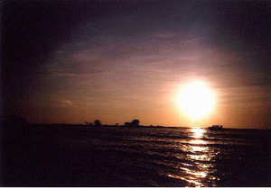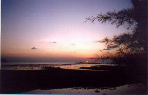 อาทิตย์ทองท่องทะเลเวลาค่ำ ยิ้มสายน้ำแย้มรับกับแดดฉาย เงาใบพร้าวพัดสะบัดจำรัสราย บนหาดทรายน้ำสลัดซัดกระเซ็น