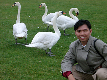 วันแรก - อังคารที่ 24 เมษายน เราเดินทางประมาณ 12 ชั่วโมงก็ถึงสนามบิน Heathrow ที่กรุงลอนดอน และนั่งรถไฟด่วน Heathrow Express ไปลงที่ Paddington ซึ่งเราได้นัดเพื่อนที่เรียนอยู่ที่นั่นเอาไว้ เมื่อไปถึงและเริ่มเห็นตัวเมือง เรารู้สึกตื่นเต้นและแปลกที่แปลกทางเล็กน้อย บ้านเมืองของอังกฤษค่อนข้างดูคลาสสิค ไม่มีตึกสูง ตึกแต่ละหลังอายุเป็นร้อยปีแต่ตกแต่งภายในใหม่ หลังจากเจอเพื่อนและต่อ Taxi ไปถึงโรงแรมที่ได้จองไว้ เราก็เก็บข้าวของจนเสร็จ และเริ่มออกไปเดินทางตามที่ต่างๆโดยเริ่มจากที่ Hyde Park ซึ่งเป็นสวนสาธารณะที่ใหญ่มากในกรุงลอนดอน สถานที่สวยงามและร่มรื่น ในทะเลสาบมีฝูงหงส์ซึ่งไม่ค่อยกลัวคนอาศัยอยู่ เราสามารถถ่ายภาพได้ใกล้พวกมันมากๆ หลายๆภาพ เมื่อถ่ายภาพจนเป็นที่พอใจเราก็ไปเดินต่อที่ Piccadilly Circus และ Oxford Circus ซึ่งเป็นย่านชุมชนที่มีร้านค้าขายของต่างๆอยู่มากมาย แต่ละร้านจะมีจุดเด่นของตัวเองและขายของเฉพาะเจาะจง บางร้านขายเสื้อผ้า บางร้านขายคอมพิวเตอร์ บางร้านขายอาหาร ซึ่งมองดูแล้วค่อนข้างแตกต่างจากเมืองไทย ที่ผู้คนจะเข้าไปรวมกันอยู่ในห้างสรรพสินค้าใหญ่ๆตามจุดต่างๆของกรุงเทพฯ ในตอนบ่ายเราเดินต่อไปที่ Bond Street ซึ่งเป็นถนนที่เต็มไปด้วยร้านค้ายี่ห้อดังๆต่างๆมากมาย และที่ โซโห ซึ่งเป็นย่าน China Town ของกรุงลอนดอน ที่ที่เราได้มีโอกาสลิ้มรสติ่มซำที่อร่อยมากที่นั่นด้วย ในตอนเย็น เราได้ไปเที่ยวที่หอนาฬิกา Big Ben และตื่นตาตื่นใจกับ British Airways London Eye วงล้อขนาดยักษ์ที่มีแคปซูลอยู่รอบๆ เคลื่อนตัวช้าๆเพื่อพานักท่องเที่ยวได้ชมกรุงลอนดอนจากมุมสูง และเราแปลกใจเล็กน้อยที่ว่าเวลา 3 ทุ่มที่นั่น ท้องฟ้ายังคงสว่างอยู่คล้าย 6 โมงเย็นของกรุงเทพฯ เมื่อเที่ยวเสร็จเราก็นั่งรถไฟใต้ดินกลับโรงแรม รถไฟใต้ดินที่นั่นค่อนข้างสะดวกมากเพราะสามารถไปได้ทุกที่โดยใช้ตั๋ว Travel Card แค่ใบเดียว แค่ชี้จุดเริ่มต้นกับจุดปลายทาง เราก็จะรู้ว่าต้องใช้รถไฟขบวนไหน ผ่านกี่สถานี ใช้เลาประมาณเท่าไร ทั้งนี้การท่องเที่ยวส่วน ใหญ่ในลอนดอน จะใช้รถไฟใต้ดินนี้เป็นหลักและการเดินต่อไปยังสถานที่ต่างๆ (ลืมบอกไปว่าตอนเรากลับมาน้ำหนักหายไปหลายกิโล)
