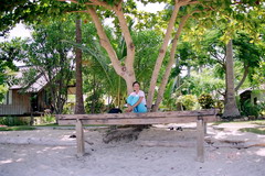 บังกะโล ไม้เก่าๆ .. หน้าบ้านมีแคร่ไม้เกือบผุที่ปลูกสร้างอย่างง่ายๆ อยู่ใต้ต้นหูกวางต้นใหญ่ที่แผ่กิ่งก้านสาขา .. บนสนามหญ้า .. มีฝูงไก่แจ้แม่ลูกอ่อนที่ชักชวนกันออกหาอาหาร .. ฉันพยายามติดตามถ่ายรูปครอบครัวของพวกมันตลอดสองวันหนึ่งคืนที่พักที่นี่ .. แต่ให้ตายสิ!! .. พวกมันคงกลัวคนแปลกหน้า .. มันจึงเดินหนีตลอด .. อดกัน .. เอ .. หรือว่าฉันหน้าตาแปลกหว่า? .. บรรยากาศเหมือนเราอยู่บ้าน .. สบายใจจริงหนอ .. บนเกาะมีบังกะโลเพียงสองแห่งเท่านั้น .. แล้วก็มีแต่เราเท่านั้นไม่มีแขกคนอื่นอีก .. ขอยืมเกาะนี้เป็นเกาะส่วนตัวสักสองวันละกันนะ ..