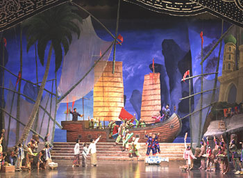 เขาเล่าว่า ฉากสีฟ้าครามเหมือนผืนน้ำเข้ามาแทนที่ การเล่นแสงและเงาทำให้ดูเหมือนกับละรอกคลื่นใต้ท้องทะเล มีหนังตะลุงออกมาบ่งบอกให้รู้ว่าเป็นการแสดงของภาคใต้ โนราห์ออกมาร่ายรำอย่างพร้อมเพรียง ฉันว่าเสียงเพลงพื้นบ้านแต่ละแห่งก็มีเอกลักษณ์ของแต่ละท้องถิ่น อย่างเช่นที่ภาคใต้นี้เสียงดนตรีที่ได้ยินก็ทำให้รู้สึกสนุกสนาน เรือสำเภาขนาดใหญ่แล่นออกมาจากด้านซ้ายของเวที มีผู้คนอยู่เต็มลำเดาว่าคงจะมาค้าขาย แล้วก็ใช่จริงๆพอพวกเขาลงมาจากเรือสำเภาลำนั้น ต่างก็หอบของลงมาด้วย ไม่ว่าจะเป็นผ้า แจกันลวดลายวิจิตรสวยงาม เพื่อมาค้าขายกับชาวบ้านที่อยู่ในละแวกนั้น