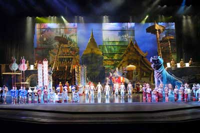 ก่อนจะเข้าประตูมีการแสดงให้ดู มีรำไทย มีช้าง มีแพะ เอ..มาเที่ยวสวนสัตว์ป่าวหว่า? ตรวจบัตรแบบเข้มแข็งมากกกก ประตูแรก เจาะรูไปหนึ่งรู เอ้า..ผ่านประตูที่สอง เจาะบัตร ไปอีกหนึ่งรู ห้ามถ่ายวิดีโอ มือถือที่มีกล้องก็ห้ามเปิด เลยไม่ได้รูปมาเลย แม่หันมากระซิบเบาๆ ทำตัวให้เหมือนคนนะลูก เขาห้ามเอาสุนัขเข้า! นั่น ...มุขแม่...พูดเสร็จก็เดินยิ้มนำหน้าไป ตรงกลางก่อน เข้าห้องมีเวทีฟ้อนรำ ชาวต่างชาติ ถูกแม่สาวฟ้อนรำ ต้อนขึ้นไปรำจนได้ อีกคน สาวเกาหลี ดูเธอมีแววรำไทยได้ดีทีเดียว ..มีบ้านเรือนไทย มีผ้าไทย (หนีไม่พ้น OTOP) มีการแสดงตลอดทางเดินเข้าโรงละคร .. สองทุ่มตรง เพลงสรรเสริญพระบารมีดังขึ้น ทุกคนก็ยืนตรง (เหมือนโรงหนังเนอะ.. ต่างกันที่โรงหนังยังมี soft drink ให้ แต่นี่มะมีน้ำสักแก้ว) แถมห้ามเอาเข้าไปด้วย