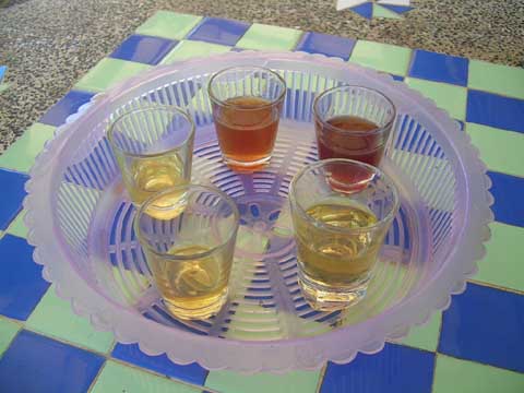 เจ้าของร้านยกไวน์ แก้วกระจุ๋มกระจิ๋มมาให้ชิม ที่เห็นอยู่นี่มี ลิ้นจี่ สัปปะรด ลูกไหน ลูกท้อ อีกแก้วจำไม่ได้แระ เมา แหะ ๆ