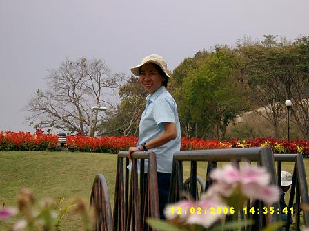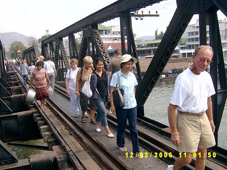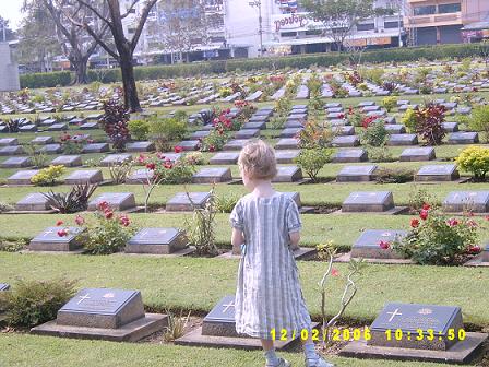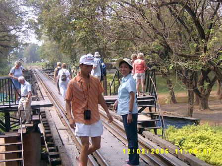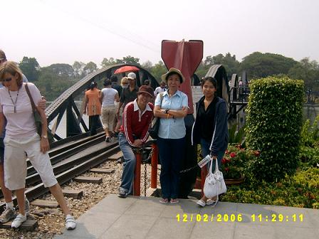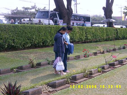 ฮัลโหล ตอนนี้เป็นไงบ้าง อยู่ไหนกันแล้วครับ หมอโทรมาเช็ค นครปฐมแล้วค่ะเราตอบ โอ้ ถึงนครปฐมแล้วเหรอ เพิ่งจะแปดโมงนิด ๆ เอง อื้อ ! ก็ครบคนแล้ว ส่วนหมอ อย่าลืมเหน็บคุณครูใหญ่ ฯ มาด้วยนะคะ ครับ ๆ ได้ครับ เสียงหัวเราะเล็ดลอดมาตามสาย ประมาณเกือบเก้าโมง พวกเราก็มาถึงจุดพักแรก คือโรงงานวุ้นเส้น (ห้องน้ำสะอาด) พวกเราลงไปยืดเส้นยืดสายและทานข้าว อาหารที่นี่ไม่แพง มีผลไม้และผักสดจำหน่ายอีกด้วย เรามองมะละกอทรงแตงโม ด้วยความประหลาดใจ มะละกอมันกลมดิ๊กขนาดนั้น รสชาติจะเป็นไงนะ พี่พระจันทร์เศร้าสนใจผักไร้สาร พอเราเดินไปดูด้วย พี่จิ๋งก็อธิบายยืดยาวราวกับนักโภชนาการ และซื้อติดรถไปด้วยหลายกำ ส่วนเราก็ซื้อขนมไปเพิ่มแคลอรี่ หนำซ้ำ ช่วงที่เราเผลอ พี่จิ๋งย่องไปซื้อมะละกอกลม มาลองให้ชิมเสียด้วย เอาล่ะ .. อิ่มท้องแล้ว ก็เดินทางต่อ จุดแรกที่พาไปเที่ยวชมคือสุสานทหารพันธมิตร นี่ ไม่ใช่ครั้งแรกที่เรามาเยือน และไม่ใช่ครั้งแรกเช่นกัน ที่เรารู้สึกสลดหดหู่ต่อชะตากรรมของพวกเขา ภาพของเชลยศึกผุดขึ้นมาในสมอง ยิ่งทำให้เรายิ่งเศร้าเข้าไปอีก พวกเขาต้องจากดินแดนถิ่นเกิดและต้องมาทอดร่าง ณ ถิ่นนี้ .. เรายืนไว้อาลัยแด่พวกเขา ในความหวังที่ดูเหมือนจะริบหรี่ .. เราหวังว่า จะไม่เกิดเหตุการณ์เยี่ยงนี้อีก โลกที่ไร้สงคราม โลกที่สงบสุข ... เราได้แต่ปรารถนา