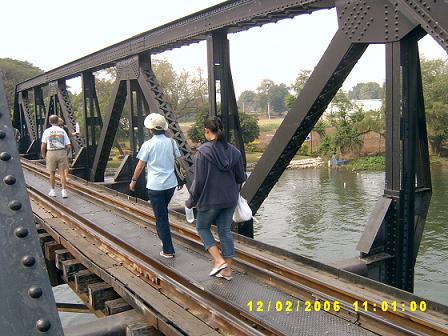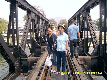 ไม่ไกลสักเท่าไหร่ ก็เป็นสะพานข้ามแม่น้ำแคว ในขณะที่เราจอดรถและยืนอ้อยอิ่ง ก็มีสาวสวยคนหนึ่งซึ่งมากับคนรัก เธอพยายามจะเปิดประตูรถของเรา..เรามองแล้วมองอีก.. ดีที่ประตูล๊อคเรียบร้อย แต่เธอก็ยังพยายามเปิดให้ได้ ขอโทษค่ะ แน่ใจนะคะว่านี่คือรถของคุณ เราเดินเข้าไปใกล้อีกนิด และถาม..จากประโยคดังกล่าว ทำให้เธอตกใจ และเขินทันที เมื่อรู้ว่า เธอจำรถผิดคัน เธอและคนรักของเธอ จอดรถถัดจากเราไปสองคัน รถไม่คล้ายกันสักเท่าไหร่ สงสัยว่า เธอคงใจลอย .. เฉพาะคุณ ไปกับเราได้นะ ฮา... เราไม่ซีเรียสนัก เพราะเรารู้ว่า เธอจำรถผิด จึงแซวให้บรรยากาศสนุกสนาน เธอส่งยิ้มหวานมาให้ ส่วนคนรักของเธอ คงล้อเธอไปตลอดทาง พี่พระจันทร์เศร้าของเราต้องมนตร์ร้านขายของที่ระลึกเสียแล้ว เห็นไปตีซี้กับหนุ่มเจ้าของร้าน ซึ่งก็มีการนัดแนะเรียบร้อยว่า ขากลับจากเดินชมสะพานแล้วจะแวะมาดูของที่ระลึกอีกที อั่นแน่ !! มือวางอันดับหนึ่งแห่งบ้านกลอนไทย ตัวจริง เสียจริง .. พี่พระจันทร์เศร้านี่เอง เดินดี ๆ นะพี่ เราเตือนพี่พระจันทร์เศร้า ส่วนทะเลใจก็เดินตามอย่างกล้า ๆ กลัว ๆ (แอบบ่นว่าเสียว) ยิ้มหน่อย พี่ นั่นแหล่ะ เดินตรงกลางนะคะพี่ กันพลาด ข้ามไปอีกฝั่งจะมีร้านขายของที่ระลึก ต้องเช็คราคาดี ๆ นะพี่ ไปดูช้างกัน นั่น ดูนั่นสิ นกยูง อูย สวยจัง เออนี่ มาถ่ายรูปตรงนี้ด้วย โห นี่เนี่ยนะ ที่จะให้ถ่าย นั่นล่ะ เอาไว้ไปตั้งคำถามเล่นๆว่า ไอ้ที่อยู่ในถุง มันคืออะไร ก๊าก .. ก่อนขึ้นรถกลับ พี่พระจันทร์เศร้าก็ได้โมบายแขวนเป็นรูปพระจันทร์หนึ่งชุด เราเองก็มองโมบายนก อยากซื้อเหมือนกัน แต่นกที่เป็นแก้ว ปากยาว จนเราคิดว่า เราหอบของตั้งแยะ เผลอๆ ได้โมบายนกปากหักไปล่ะ แย่เลย..
