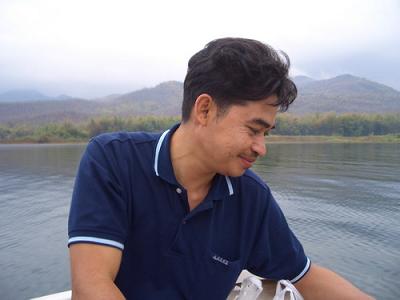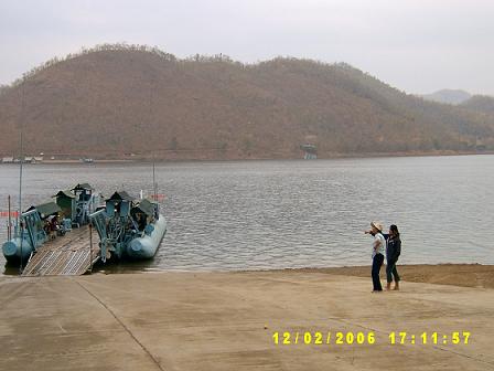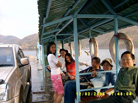 พวกเรารอหมอที่นั่นประมาณสิบห้านาที ช่วงที่รอ ก็ชมวิวไปเรื่อย บางคนก็ทานไอศกรีม..นี่ ยังไม่นับอีกบางคนนะ ที่นั่งจิบเบียร์รอไปเรื่อย ระยะทางไกลแค่ไหนก็ไม่ใช่อุปสรรค ๕๕๕..รถอันกะติ๊ดของหมอสีแดงแปร๊ด พอเลี้ยวโค้งเข้ามา จึงเป็นจุดให้สังเกตุง่าย พวกเราเดินไปหา พร้อมกับทักทายไปยังคุณครูใหญ่ด้วย ตื่นกี่โมงเนี่ย ครูใหญ่ฯ ผมตื่นเช้านะครับ อั่นแน่ อั่นแน่ .. ตื่นมาแล้วนอนต่อเหรอ โทรมเชียว เสียงของคนที่จิบเบียร์ตะกี้ ทักครูใหญ่ สวัสดีครับพี่ แหม ผมมาไกลนะครับ พอหอมปากหอมคอ .. (เอ๊ะ ! ใครกะใครหอมกัน) จากนั้นพวกเราก็ลงแพข้ามฟาก ..ไม่อยากบอกเล้ย ช่วงกลางวันเราโม้ไว้แยะ อยากรู้มั๊ยล่ะว่า โม้อะไรบ้าง ที่ท่าสนุ่น เราจะไปถึงนั่นช่วงเย็น พระอาทิตย์ที่ค่อย ๆ เลื่อนลง มองเห็นจากซอกภูเขาจะสวยมาก ท้องน้ำจะเป็นสีทอง คิดดูนะพี่ พระอาทิตย์ค่อย ๆ เลื่อนลง สลับกับพระจันทร์ที่ค่อย ๆ เลื่อนขึ้น สุดยอดเลย เคยเห็นมาเหรอ มีเสียงลอย ๆ ถามมาในตอนนั้น เปล่าค่ะ หมอเคยเล่าให้ฟัง ที่เหลือ โม้เพิ่มอ่ะ ๕๕๕