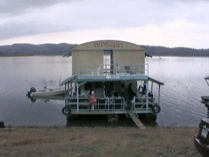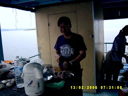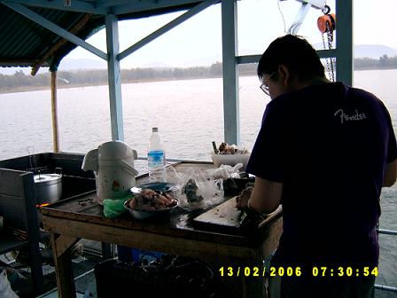 มีระเบียงอยู่ทั้งสองด้าน พร้อมกับมีเก้าอี้ผ้าใบกางเตรียม ลองนึกภาพตามละกัน ส่วนชั้นล่าง ก็เป็นแบบนี้นะ เอางี้ละกัน ขอแบ่งส่วนเป็นสามส่วน ... ส่วนหน้า จะเป็นโต๊ะอาหารใหญ่ สองโต๊ะ มีพื้นที่เหลืออีกกว้าง มีถังแช่ใหญ่ พร้อมสรรพ ถังแช่ที่ว่าใหญ่แล้ว เมื่อพวกเราบรรจุอาหารสดลงไป ดูแล้ว มันก็ไม่ใหญ่.. เราคิดว่า มันน่าจะเป็นอาหารสำหรับสักสามวันมากกว่า ไม่น่าจะแค่สามมื้อ .. ส่วนกลาง เหมือนเป็นส่วนของบ้าน มีเครื่องเสียงคาราโอเกะ อั่นแน่ ไม่เบา .. มีโน๊ตบุ๊ค มีส่วนของเครื่องยนต์บังคับเรือ(แพ) ตรงนี้ เขาก็เตรียมที่นอนให้ด้วย แจ๋วแฮะ ดนตรีมีพร้อม เรามองเห็นเบ็ดตกปลาวางอยู่ที่มุมห้อง .. โอ้โห .. นี่นะ ถ้าไม่ติดว่าเป็นวันพระ คงได้สนุกกัน เสื้อชูชีพและห่วงยาง เขาแขวนไว้เป็นจุด ๆ ให้เห็นได้ชัด เราเล็งไว้แล้ว คาดว่า ไม่พลาดแน่ หากเกิดกรณีฉุกเฉิน ส่วนท้ายของเรือ ก็จะเป็นส่วนของครัว ห้องน้ำ และบริเวณซักล้าง ...อุปกรณ์ครัว เตาถ่านใหญ่ สองเตา เตาแก๊สอีกหนึ่งเตา หม้อ กะทะ จาน ชาม ช้อน ....เพียบ จุดสำคัญที่สุดคือห้องน้ำ .. เราย่องไปสำรวจเป็นจุดแรกเลย ตอนที่ลงแพมา สะอาดมาก ๆ เราคิดว่า เราตัดสินใจถูกนะ ที่เลือกแพลำนี้ .. ทุกอย่างดูครบครัน และที่สำคัญ เจ้าของอัธยาศัยดี ตรงนี้ พี่พระจันทร์เศร้าคงการันตีให้ .. ใช่ป่ะ พี่ ๕๕๕ ... ยังไม่เท่านั้นนะ ยังมีสปีดโบ๊ตและเรือพาย ผูกติดมากับแพด้วย .. สนุกล่ะ ทีนี้