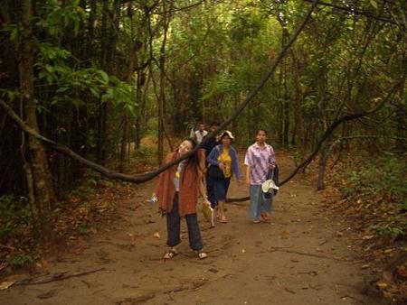 อ้อ ! ลืมบอกไป จุดที่ผูกแพไว้เมื่อคืน เป็นเกาะร้าง ชื่อเกาะม้านอน ประมาณเจ็ดโมงกว่า ๆ แพก็ล่องไปยังน้ำตกแม่ห้วยขมิ้น .. ขณะที่เรือล่องอยู่นั่น พวกเราก็เสวยพระกระยาหารเช้า .. ฮา แพจอดอยู่ห่างจากท่า แล้วทุกคนก็ลงเรือสปีดโบ๊ต เพื่อเข้าเทียบท่าของน้ำตกแม่ห้วยขมิ้น ไอหมอกยังคงอ้อยอิ่งอยู่ทั่วไป เราส่งเสื้อชูชีพให้พี่พระจันทร์เศร้าและทะเลใจ ..เตือนกันว่า อยู่ใกล้น้ำ อย่าประมาท !! น้ำใสมาก จนมองเห็นต้นไม้ที่อยู่ในน้ำ บางจุดก็มองเห็นโขดหินใต้น้ำ เจ้าของแพพาพวกเราไปส่งขึ้นท่า แล้วบอกว่า อีกสามชั่วโมงจะมารับ ถึงตอนนี้ พวกเราไม่แต่ขนมติดตัวกันคนละนิดละหน่อย เงินไม่ได้พกมา พากันเดินเกาะแม่เลี้ยงพระจันทร์เศร้าขนาบหน้า ขนาบหลัง หอมจัง ผลอะไร รู้จักไหมคะ ครูใหญ่ เราถามครูใหญ่ซึ่งเดินอยู่ข้าง ๆ มะเดื่อครับ ผลแดง ๆ ที่ร่วงจะหอม อื้อ .. หอมจัง