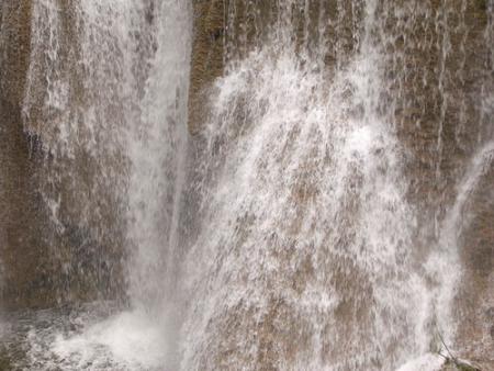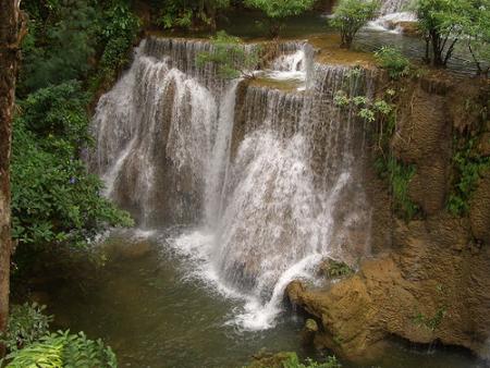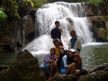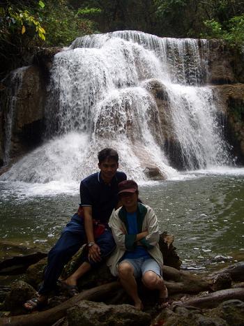 เราเดินไต่ขึ้นเขาไปเรื่อย ๆ แวะหยุดพักตามทาง ความตั้งใจแรก ก็คือ จะไปให้ถึงชั้นบนสุด ซึ่งมีอยู่ ๗ ชั้น พอถึงชั้นที่ ๕ ก็มีบางคนเริ่มโยเย น่านะพี่ อีกสองชั้นเอง ไหน ๆ มาทั้งทีแล้ว ก็ให้สุด ๆ ไปเลย พวกเอ็งจะไปก็ไป ข้าจะนั่งตรงนี้แหล่ะ มีปัญญาก็แซะข้าไป ว่าแล้วก็นั่งปุ๊กตรงโคนต้นไม้ งั้นเราเดินลงไปชั้น ๓ กัน ตรงนั้นมุมสวย มีแอ่งให้เล่นน้ำ ทุกคนเห็นด้วย ความจริง เราน่ะ เมื่อยแสนเมื่อย แต่ก็ทำฟอร์มชวนเดินต่อไปซะงั้น น้ำค่อนข้างเย็น เราลงไปแช่อยู่นานสองนาน ก็ยังทำใจไม่ได้เลย ท่อนล่างแช่น้ำ ท่อนบนยังไม่เปียก ขนก็ลุกซู่เป็นระยะด้วยความหนาว พอขนลุก ก็เอาน้ำลูบ สักพักพอแขนแห้ง ขนก็ลุกอีกล่ะ ... บ้าตาย ขากลับเราเดินล้าหลัง เพราะรองเท้าเปียก จึงเดินไม่ค่อยถนัด
