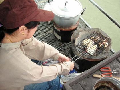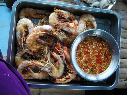 เอาอีกล่ะ มื้อกลางวัน.. ปีกไก่บนสองกิโลที่หมักเครื่องไว้ ก็เริ่มลงสรงในกะทะ ส่วนปลากดก็จัดการผัดฉ่า ผัดผักกวางตุ้งน้ำมันหอย น้ำพริกกะปิ แจ่วบอง น้ำพริกหนุ่ม พร้อมเครื่องเคียงยังพร้อมอยู่ คราวนี้มีแกงจืดหม้อใหญ่ด้วย มีทั้งลูกชิ้น และปลา เราแอบแบ่งมาบางส่วน มาเพิ่มไข่ต๊อกลงไป มาเขื่อน แต่ก็มีซีฟู๊ดให้กิน .. ครูใหญ่กล่าวเหน็บได้อย่างน่ารัก กีกี้จัดการกับปลาหมึก ล้างผึ่งรอย่าง ส่วนเราก็ย่างกุ้ง ชุดแรกในถาด เราถือวิสาสะ เอามาชิมน้ำจิ้ม หมอก็ร่วมด้วยนะ ไม่รู้ล่ะ ต้องหาตัวหาร ปรากฏว่า ถาดแรก แค่ชิม ก็หมดตั้งแต่ในครัวเสียแล้ว หน่วยคิวซีชุดนี้ ถนัดชิมเสียจริง ทำไมมีพริกไทยสดล่ะ เราถามหมอ ผมเตรียมมาครับ หอมจังเลย น่าทานด้วย เวลาที่หมอยิ้ม ถ้าสังเกตุให้ดี จะเห็นลักยิ้มนิด ๆ และถ้าสังเกตุมากกว่านั้น จะรู้ว่า หมอชอบปิดตายิ้ม ..ฮา หมอคะ ครับผม หมอขานรับ ทั้งที่มือยังถือตะหลิว เสื้อตัวใหม่ อ๋อ ที่มีคนส่งมาให้หรือครับ อื้อ นั่นล่ะ .. แกะห่อจากพัสดุ ก็เอาลงแพ๊คกระเป๋าเลย ไม่ได้ซักด้วยค่ะ สวยครับ อาหารก็อร่อยที่สุดในโลกเลยค่ะ