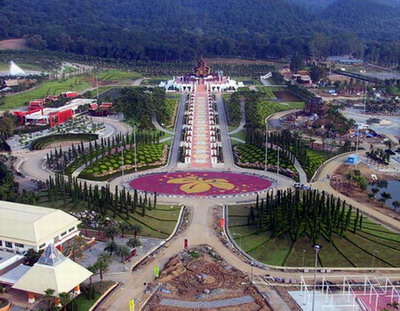 ขาที่ทำด้วยหินสี  หน้าสุดของแถวทหารชายหญิงมีขบวนนางรำถือพานดอกไม้ต่างสีนานาพันธุ์ยืนคอยอยู่    พอ