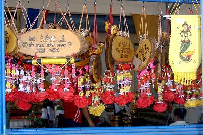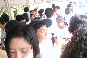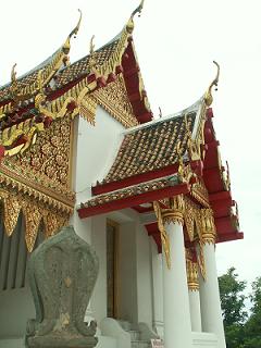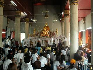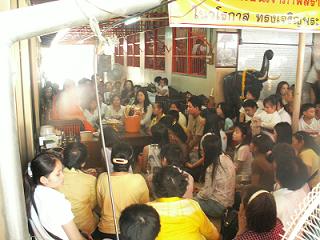 อิ่มแล้ว ทีนี้ไปไหนไปกัน ถัดจากนี้ไปที่วัดราชประดิษฐาน แปลได้ลงตัวเป๊ะ น่าจะเป็นวัดที่พระราชาสร้าง วัดนี้หากใครดูภาพยนตร์เรื่องสุริโยทัย คงจะพอนึกออก คือวัดที่พระเทียรราชาออกผนวชเพื่อลี้ราชภัยนั่นเอง นึกไปนึกมา วัดนี้เต็มไปด้วยประวัติศาสตร์เกี่ยวข้องกับราชวงศ์ในสมัยนั้น (รายละเอียดไม่ขอเล่าดีกว่า เดี๋ยวมั่ว) บ่ายสามกว่า ๆ แล้ว ทางวัดเลี้ยงก๋วยเตี๋ยว แต่เราก็อิ่มมาก ๆ ก็เลยเดินโต๋เต๋ย่อยอาหารในละแวกนั้น พลัดกับเพื่อนหายตามเคยสิน่า ก็เลยเดินเลี่ยงไปล้างหน้าล้างตาสักหน่อย เดินจนเหงื่อโซมตัวเชียว ที่ศาลาพระภิกษุรูปหนึ่งเรียกให้ไปหา และมอบเชือกถักให้แก่เรา ตอนแรกเราก็ไม่รู้หรอก พอดีเสื้อสีม่วง เราก็เลยบอกสีม่วงได้มั๊ย ที่ไหนได้ เขาต้องใส่ให้ตรงสีประจำวันเกิด เปิ่นชะมัดเลยเรา ถ้าเพื่อนไม่บอก ก็ไม่รู้นะเนี่ย แต่ก็ยังดี ไปเปลี่ยนเป็นสีฟ้าได้ แถมเพื่อนยังให้น้ำมนต์มาอีกขวดด้วย