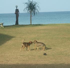 (อ้าว จริงๆ ฉันนั่งสังเกต มันเงียบๆ ตลอด สี่วันที่อยู่ที่นั้น) มันจะรับแขกที่หน้า ร้านอาหาร อยู่อย่างนี้สักพัก กะว่า อาหารโต๊ะไหนเสร็จแล้ว ก็จะเดินกลับไปทักทายพร้อมกับนอนรอที่พื้น เพื่อรอขอ อาหารจากแขก ก็อย่างที่บอก ฝรั่งเป็นชนชาติที่รักสัตว์อยู่แล้ว เค้าจะไม่โยนของที่เค้าทานเหลือให้เจ้าพวกนี้เด็ดขาด หยิบอะไรทาน หนึ่งคำ ต้องป้อนเจ้าพวกนี้หนึ่งคำ หากเป็นแขกคนไทย คงได้โดน ล้งเล้งไปแล้วว่าร้านอาหารทำไม มีเจ้าสุนัขตัวป่วน มาวิ่งวุ่นเต็มไปหมด ขนาดฉันนั่งมองเจ้าพวกนี้ยังรู้สึกรำคาญ แต่อย่าไปตะโกนไล่เสียงดังโวกเวก เป็นอันขาด เพราะ จะไม่เป็นที่พอใจ ของลูกค้าฝรั่งทันทีรีบปกป้องเจ้าพวกนี้