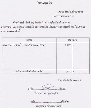 ใบสำคัญการชำระเงิน ในเบื้องต้น โอนเงินไปให้โรงเรียน จำนวนเงิน 27,000. บาท และทางโรงเรียนได้จัดการซื้อวัสดุอุปกรณ์ไปแล้ว จำนวน 27,885 บาท จะต้องมีการโอนเพิ่มเติมอีก เนื่องจากวัสดุก่อสร้างยังไม่ครบถ้วนและขึ้นราคา โดยประเมินคร่าว ๆ ในส่วนที่เป็นค่าใช้จ่ายที่จะต้องโอนเงินเพิ่มไปอีก7,165 บาท 1. วัสดุข้อต่อ ก๊อกน้ำ อ่างน้ำ กระเบื้อง ท่อน้ำ กาวประปา สีน้ำ ประมาณ 3,080 บาท 2. ค่าแรงสำหรับนายช่าง 2 นาย(ไม่รวมภารโรง) วันละ 200/คน ประมาณการ 8 วันทำการ เท่ากับ 3,200 บาท 3. และอีก 885 บาท สำหรับส่วนเกินของยอดบิล 4 ใบ
